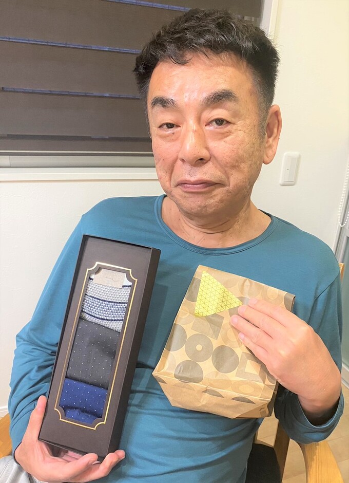 父の日です。 どこのお家も父の日のプレゼントは悩みます。 今年は、入浴剤と靴下の詰め合わせ! いつまでも元気で、オシャレは足元からですね~。